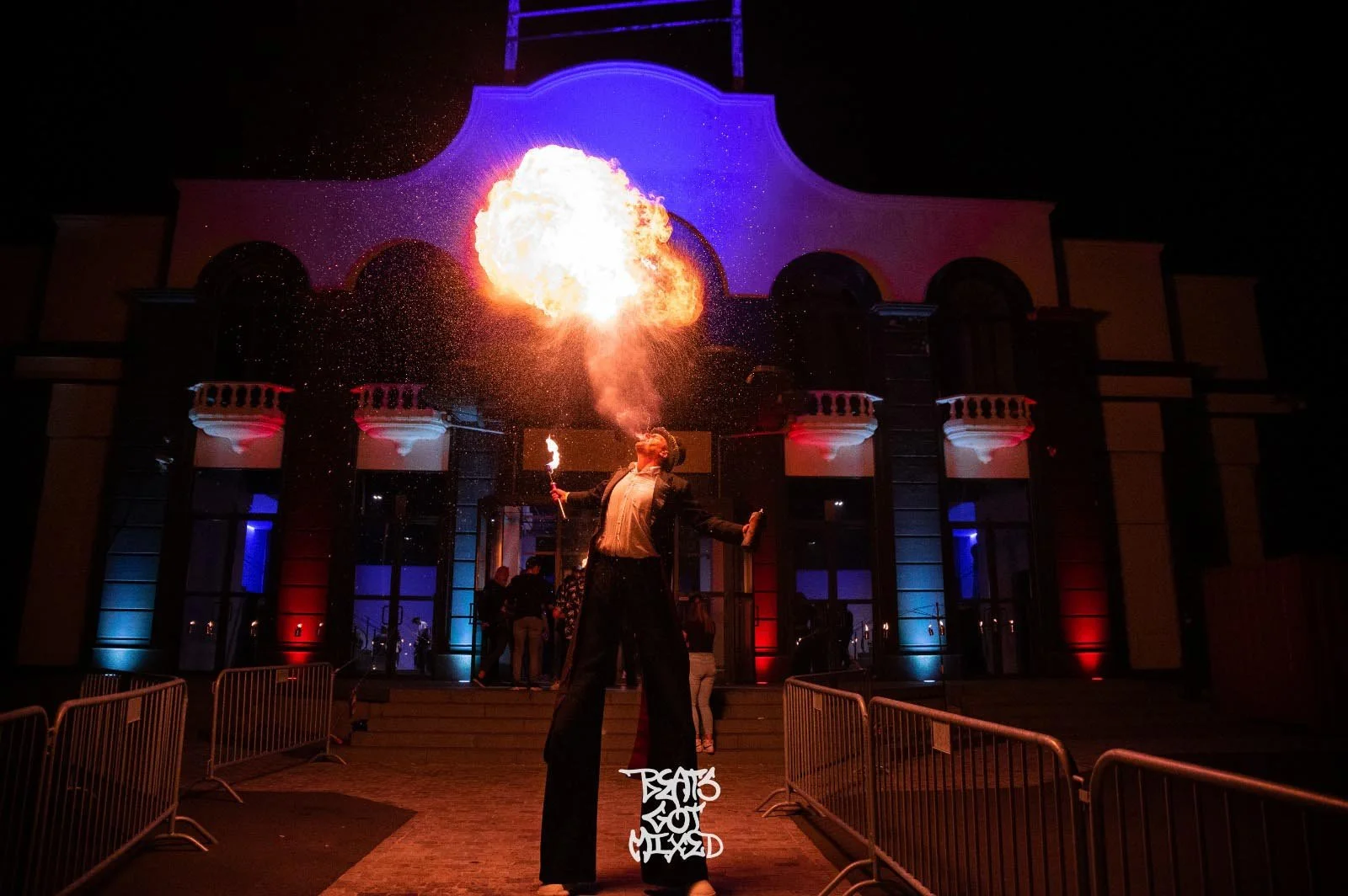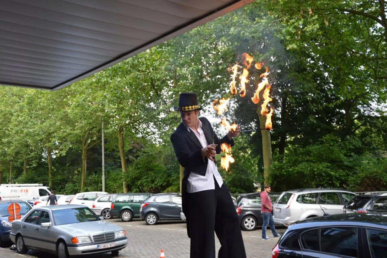 Dit type ontvangst is ideaal te combineren met een later showmoment. Veel organisatoren kiezen voor deze opbouw: eerst onthaal voor sfeer en verwondering, daarna een solo- of duo-vuurshow als finale.