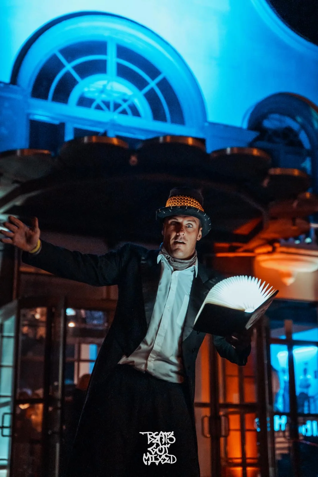 Een LED-onthaal (lichtjongleren) of op stelten kan dezelfde functie vervullen met een gelijkaardige impact. In dat geval brengen we een groot boek mee, waarmee we op een ludieke en grappige manier “controleren” of gasten wel welkom zijn, een speels interactiemoment dat meteen ijs breekt.