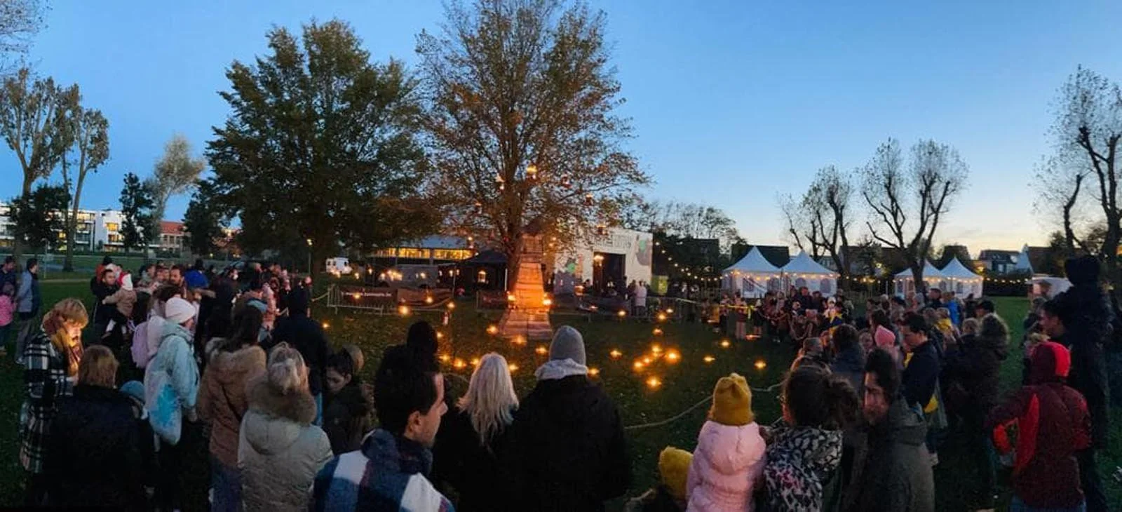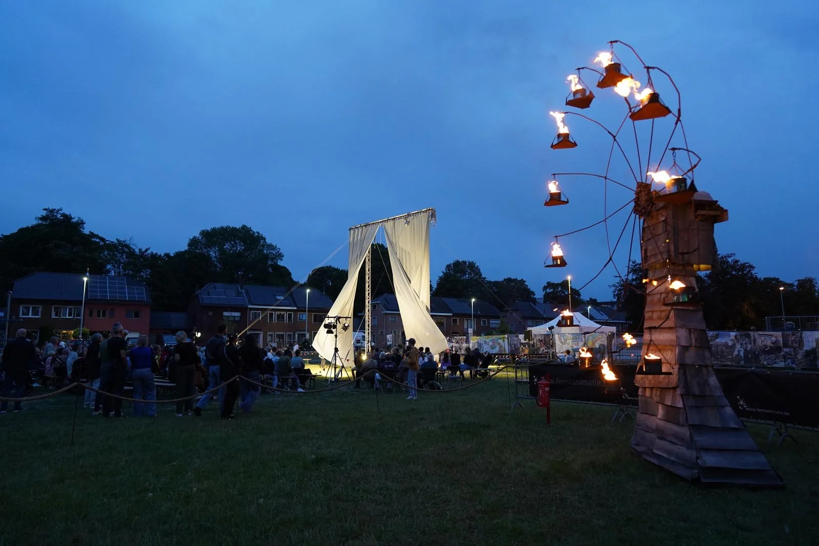 Ze vormt een warme en uitnodigende blikvanger op het terrein en zorgt voor een sterk visueel ankerpunt tijdens het avondmoment. Eenmaal opgebouwd, blijft die hele avond aanwezig.